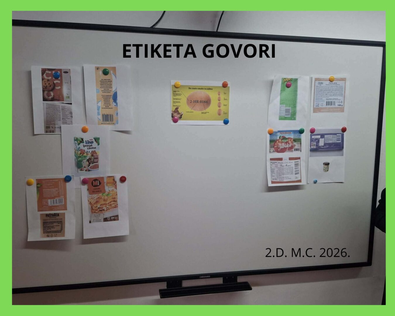Učenici su također učili što je etiketa i zašto je važna. Etiketa bi trebala pružiti informacije o proizvodu, njegovim sastojcima i podrijetlu. Međutim, učenici su uočili da etikete često ne daju dovoljno jasne informacije ili ponekad izgledaju više kao reklama nego kao stvarno objašnjenje proizvoda. Naučili su da neki izrazi na etiketama mogu biti nejasni, poput izraza „prirodne arome“, koji ne objašnjava točno što proizvod sadrži.