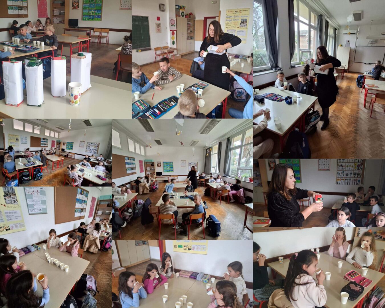 Sljedeći školski sat učenici 2.d razreda sudjelovali su u kušaonici voćnih sokova i učili kako se proizvodi mogu razlikovati iako dolaze od istog voća. Učenici su kušali tri različita soka od naranče, pri čemu su ambalaže bile prekrivene kako ne bi mogli prepoznati proizvod prema izgledu ili nazivu.