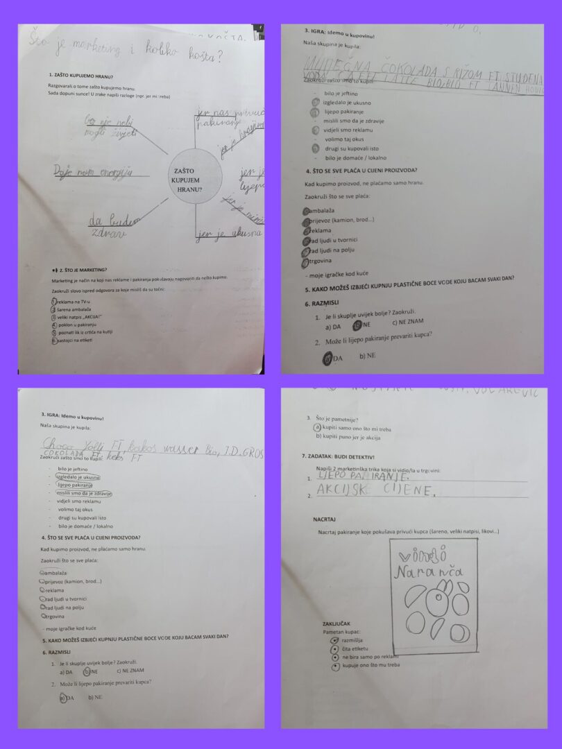 Na slijedećem satu tijekom rasprave učenici su učili što znači pojam marketing. Zaključili su da marketing predstavlja način na koji proizvođači reklamama, slikama i dizajnom pokušavaju privući kupce i potaknuti ih na kupnju. Učenici su shvatili da lijepa ambalaža ne znači uvijek i kvalitetniji proizvod. Uočili su da neki proizvodi imaju jednostavan dizajn, ali jasne informacije, dok drugi proizvodi izgledaju zanimljivo i šareno, ali ne daju puno korisnih podataka. Za bolje razumijevanje učiteljica je napravila listiće.