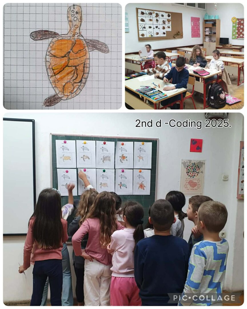 Drugu aktivnost izradili su u parovima. Jedan tim je pisao kod počevši od male točke, a drugi tim je dekodirao. Naši drugaši su pisali kod, a učenici iz Španjolske su ga dekodirali. Pisanjem koda crtali su kornjaču glavatu želvu. Učenici su glasanjem odabrali najbolji rad.