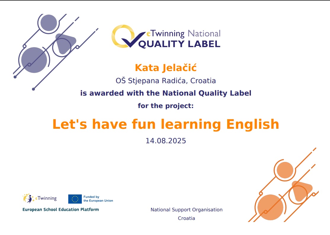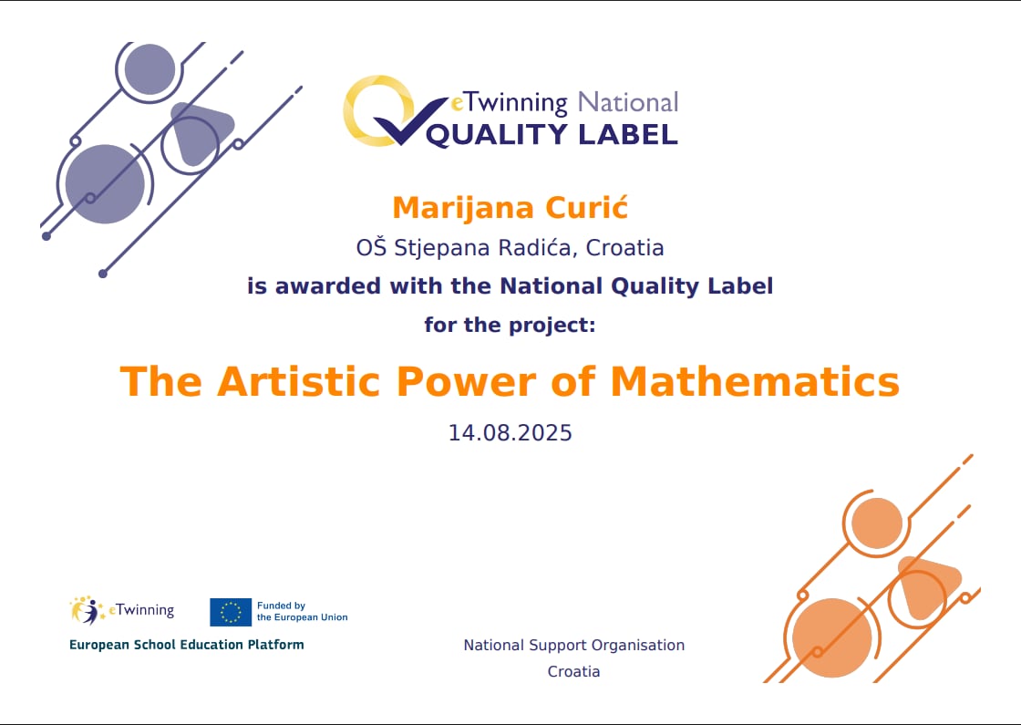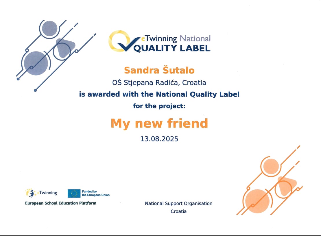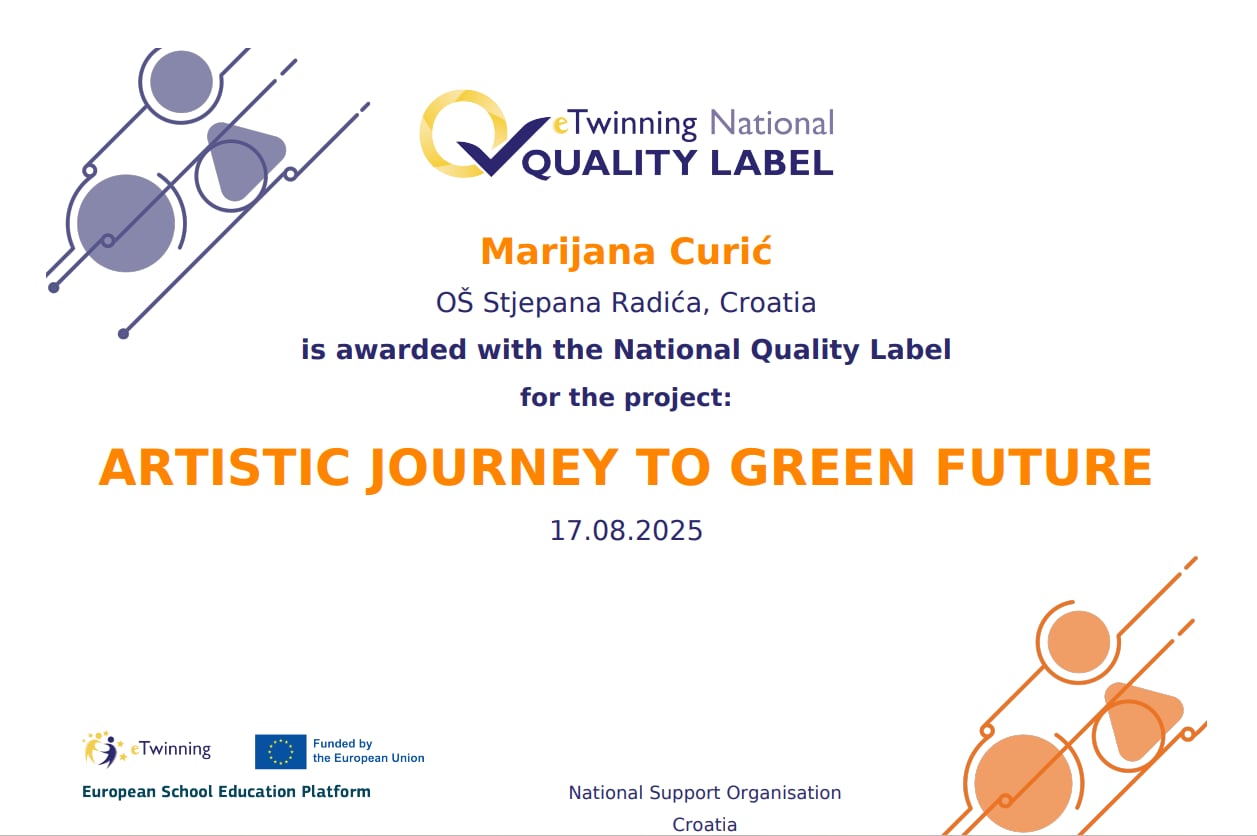 Dodijeljene su nacionalne oznake kvalitete rada na eTwinningu za školsku godinu 2024./2025. koju dodjeljuje nacionalna organizacija za potporu (u Hrvatskoj je to Agencija za mobilnost i programe EU – AMPEU) nakon evaluacije prijava koje podnose sami odgojno-obrazovni djelatnici za svoje izvrsne europske projekte, čime se nagrađuje osobni angažman i kvaliteta rada na projektu.
