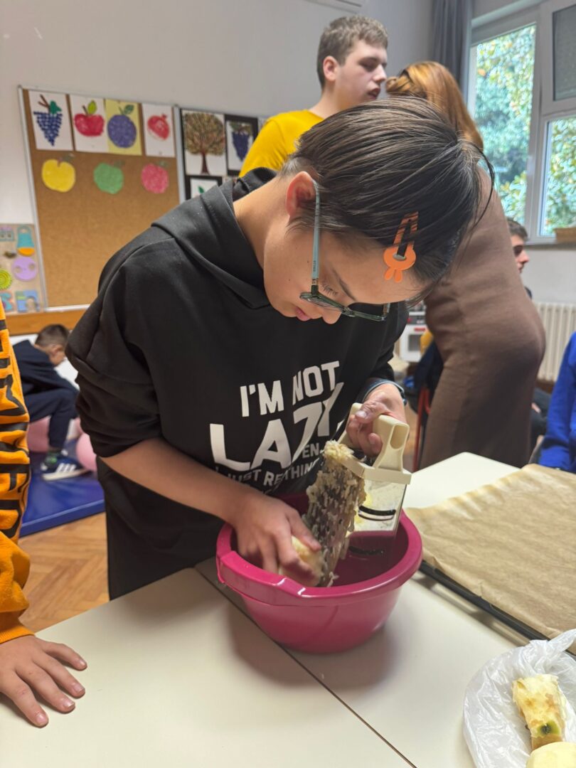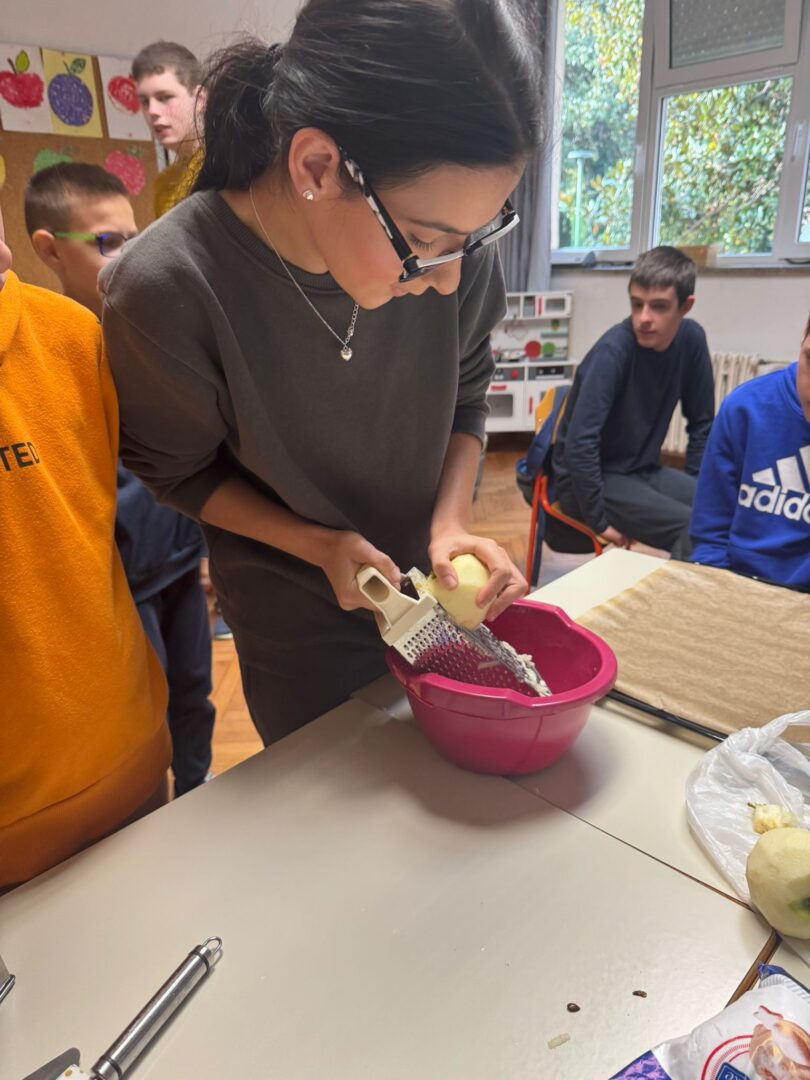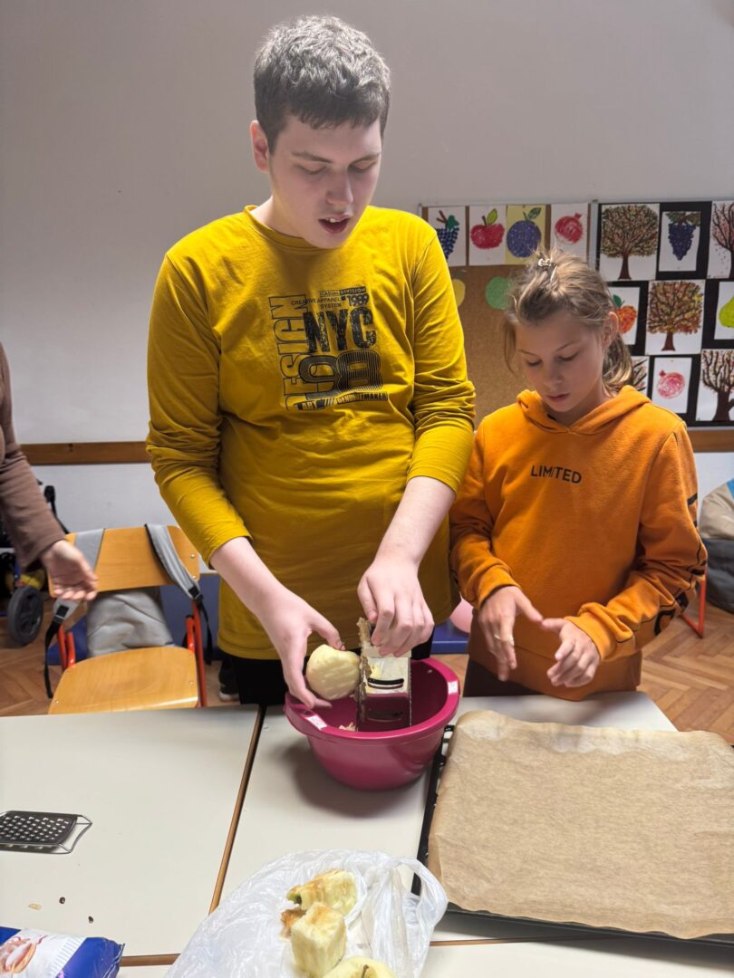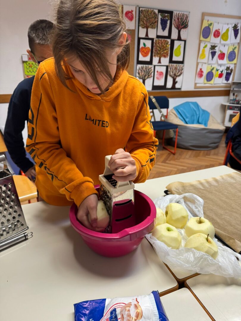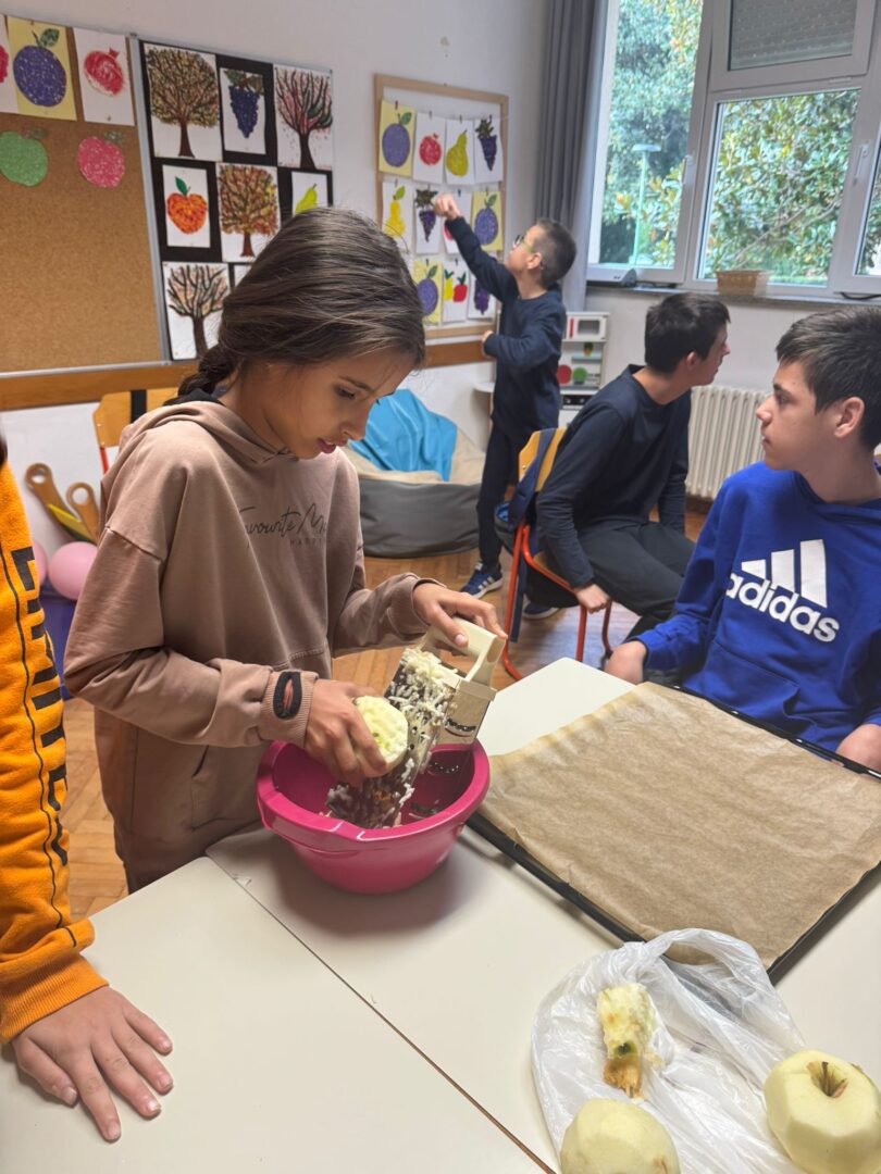 Prije samog pečenja učenici su marljivo prali jabuke, gulili ih, ribali te rezali na komade. Aktivnost je potaknula razvoj samostalnosti, suradnju i osjećaj zajedništva. Tijekom pripreme učionice su ispunili prepoznatljivi mirisi jabuka i cimeta – mirisi koji podsjećaju na toplinu doma, druženje i zajednički rad.