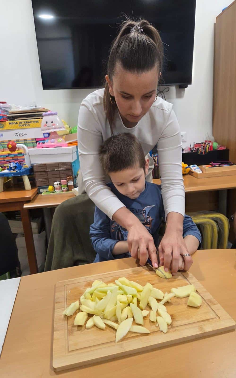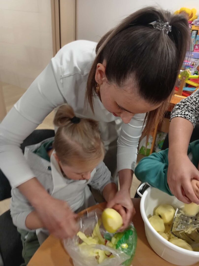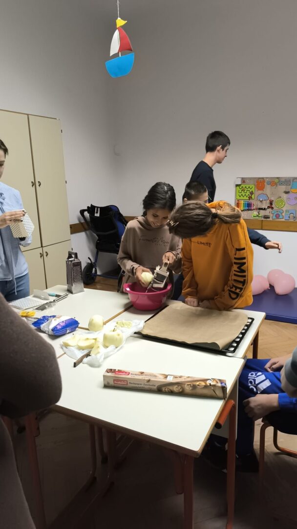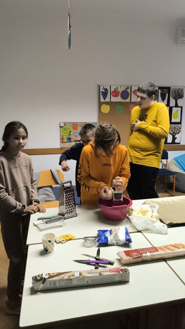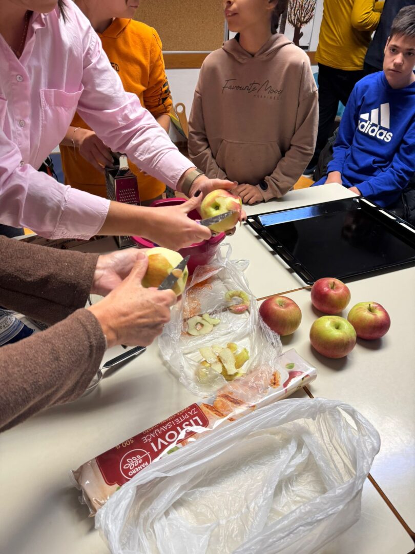 Prije samog pečenja učenici su marljivo prali jabuke, gulili ih, ribali te rezali na komade. Aktivnost je potaknula razvoj samostalnosti, suradnju i osjećaj zajedništva. Tijekom pripreme učionice su ispunili prepoznatljivi mirisi jabuka i cimeta – mirisi koji podsjećaju na toplinu doma, druženje i zajednički rad.