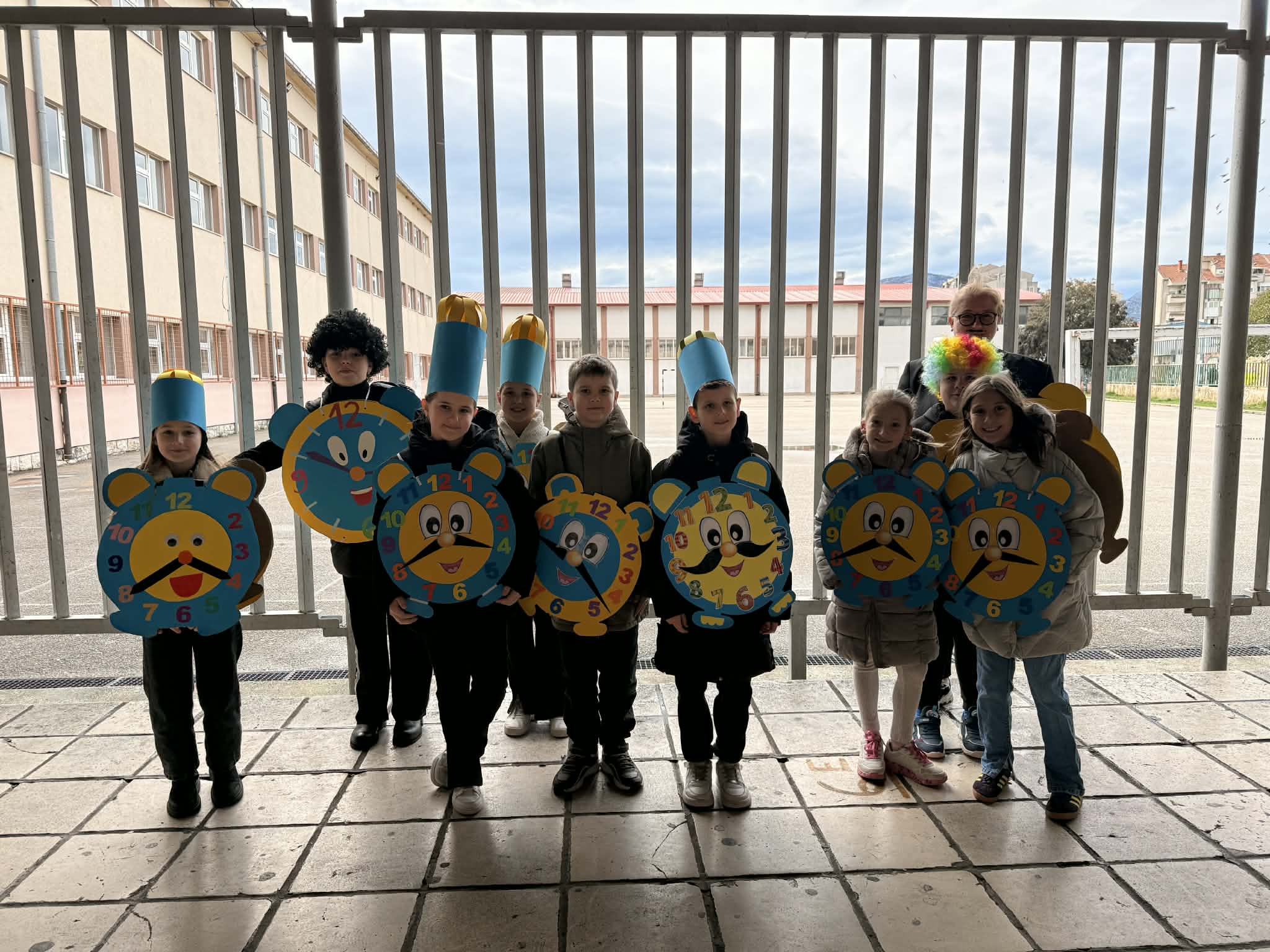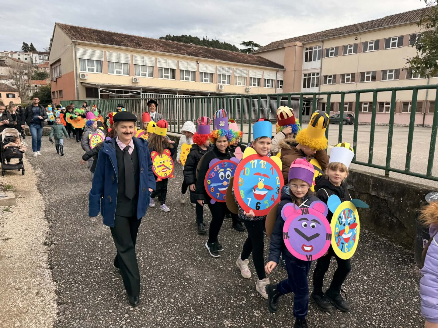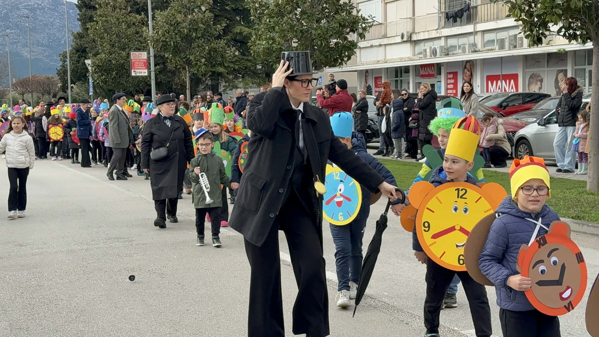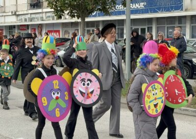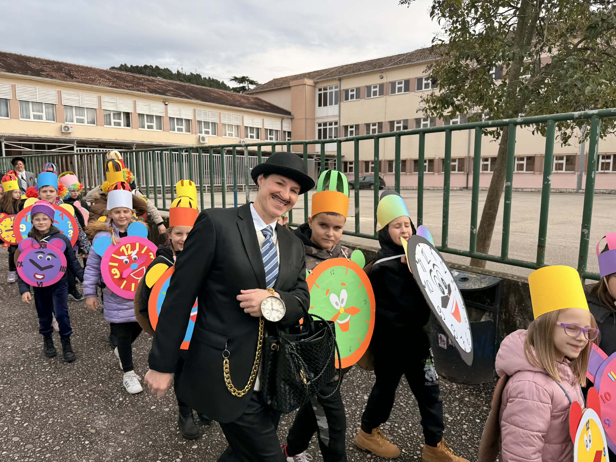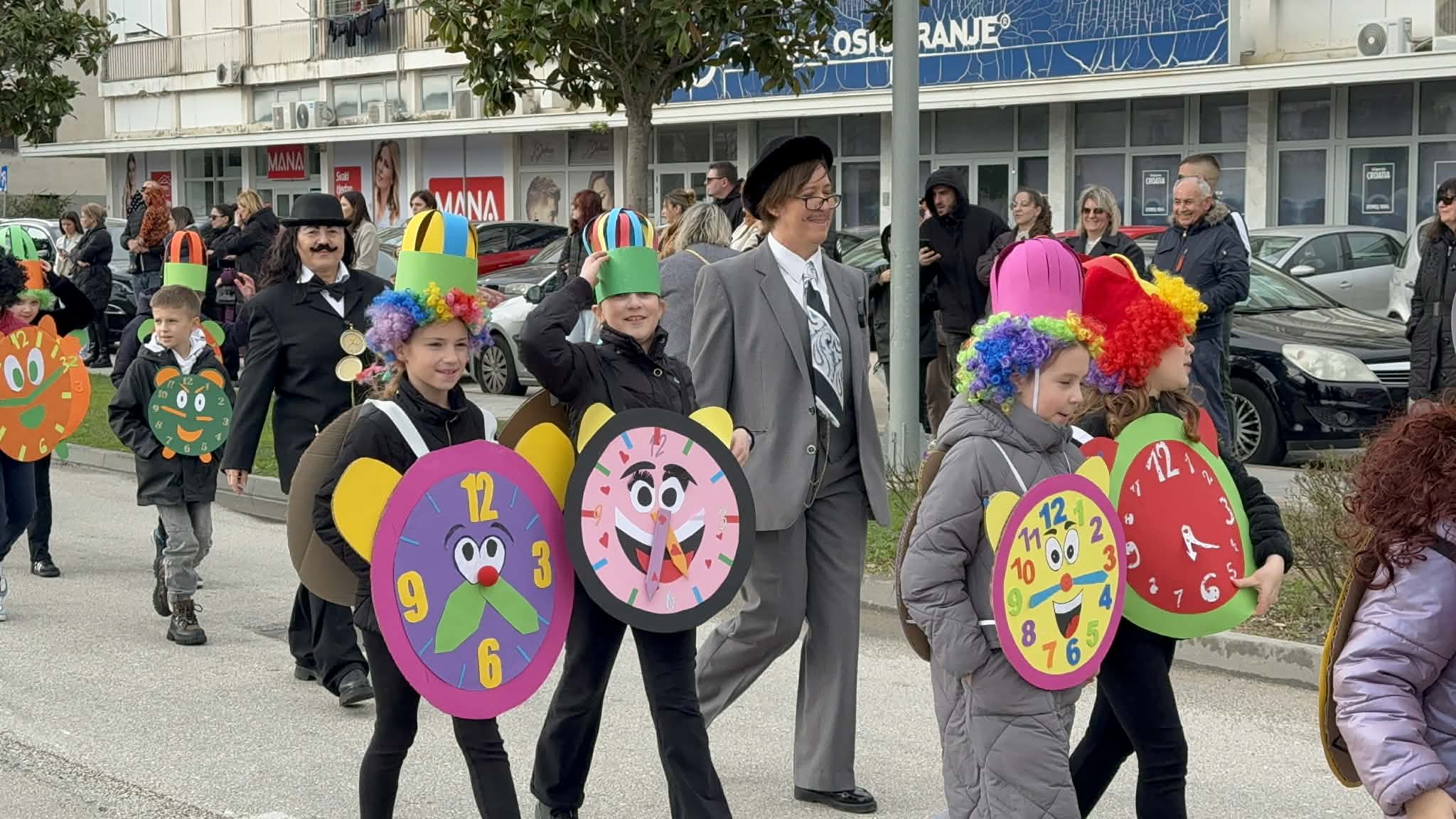 1. veljače 2026. godine u 14:00 sati, točno na vrijeme, iz Sportske ulice krenula je Velika povorka ulicama grada. Učenici naše škole ovog su puta postali mali, šareni i maštoviti satovi. Oko stotinjak veselih i nasmiješenih učenika neumorno je odrađivalo svoju „satnu dužnost“ točno ili ponešto manje točno. Uz satove smo uočili elegantnu i dobro raspoloženu gospodu s malim džepnim satovima. Ispod crnih uglađenih brčića, krile su se njihove učiteljice,koje neumorno njeguju tradiciju grada prenoseći je na nove naraštaje.  Vrijeme provedeno u maškarama nam je jednostavno proletjelo, ali uspomene su nam ostale urezane u sjećanje. Ove je godine vrijeme zaista bilo na našoj strani. S nestrpljenjem već iščekujemo sljedeće maškare i najavljujemo svoj povratak. „Festina lente – Požuri polako!“.
