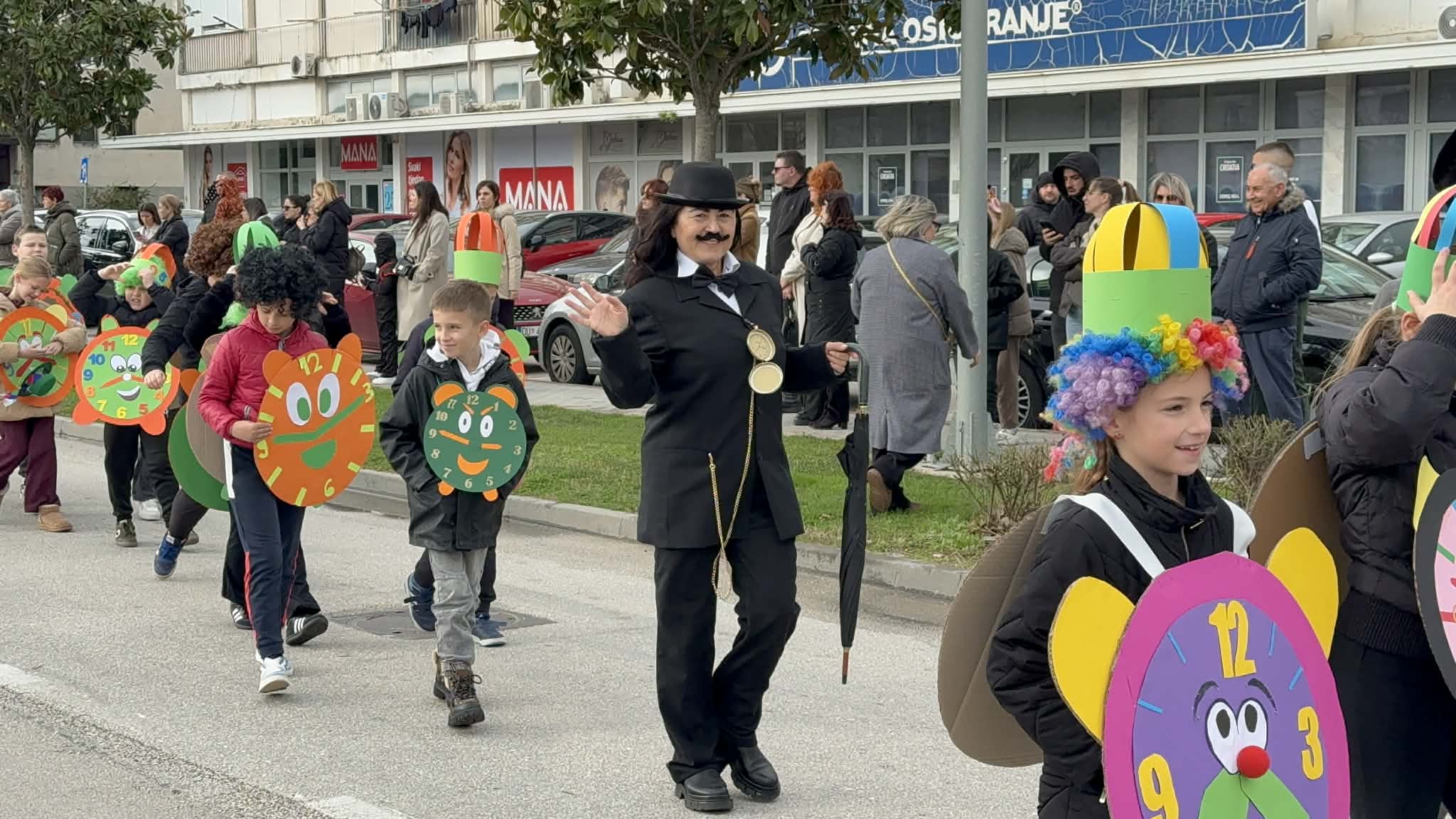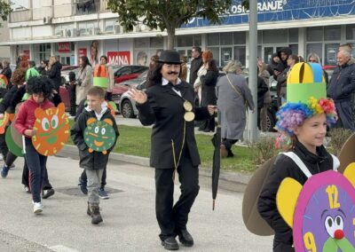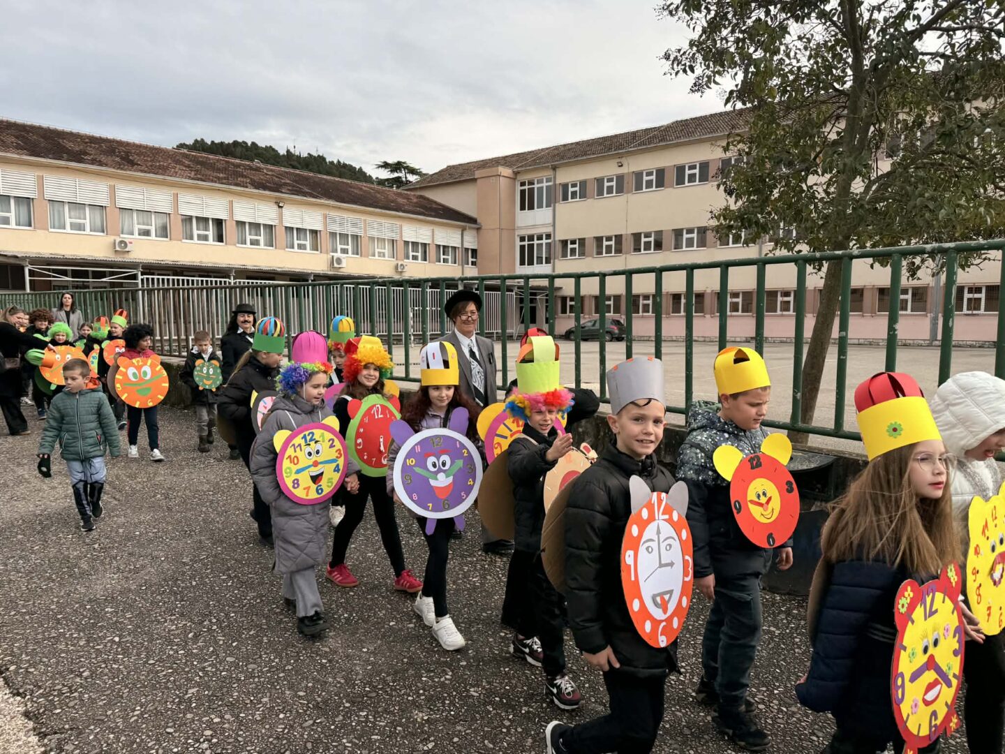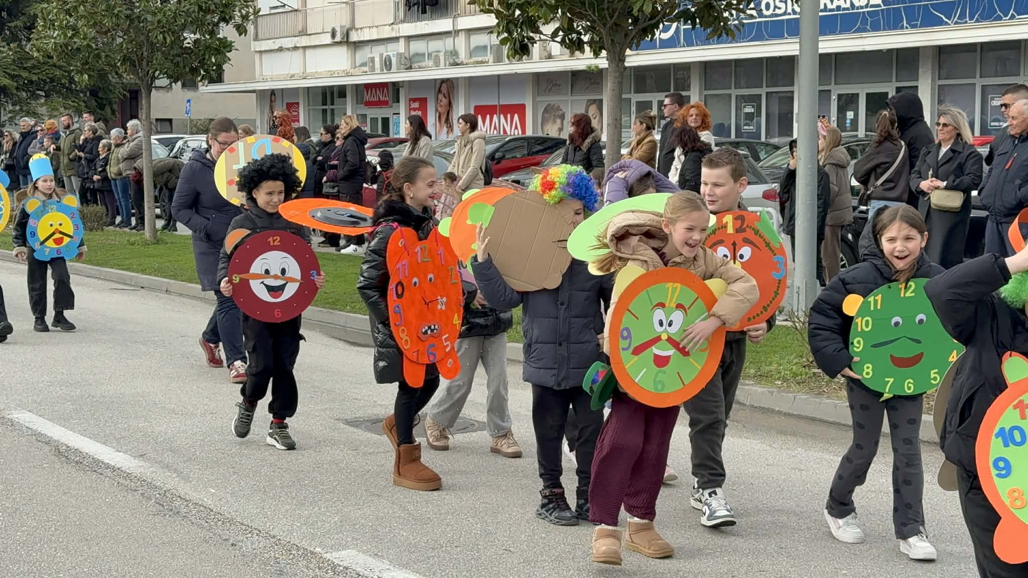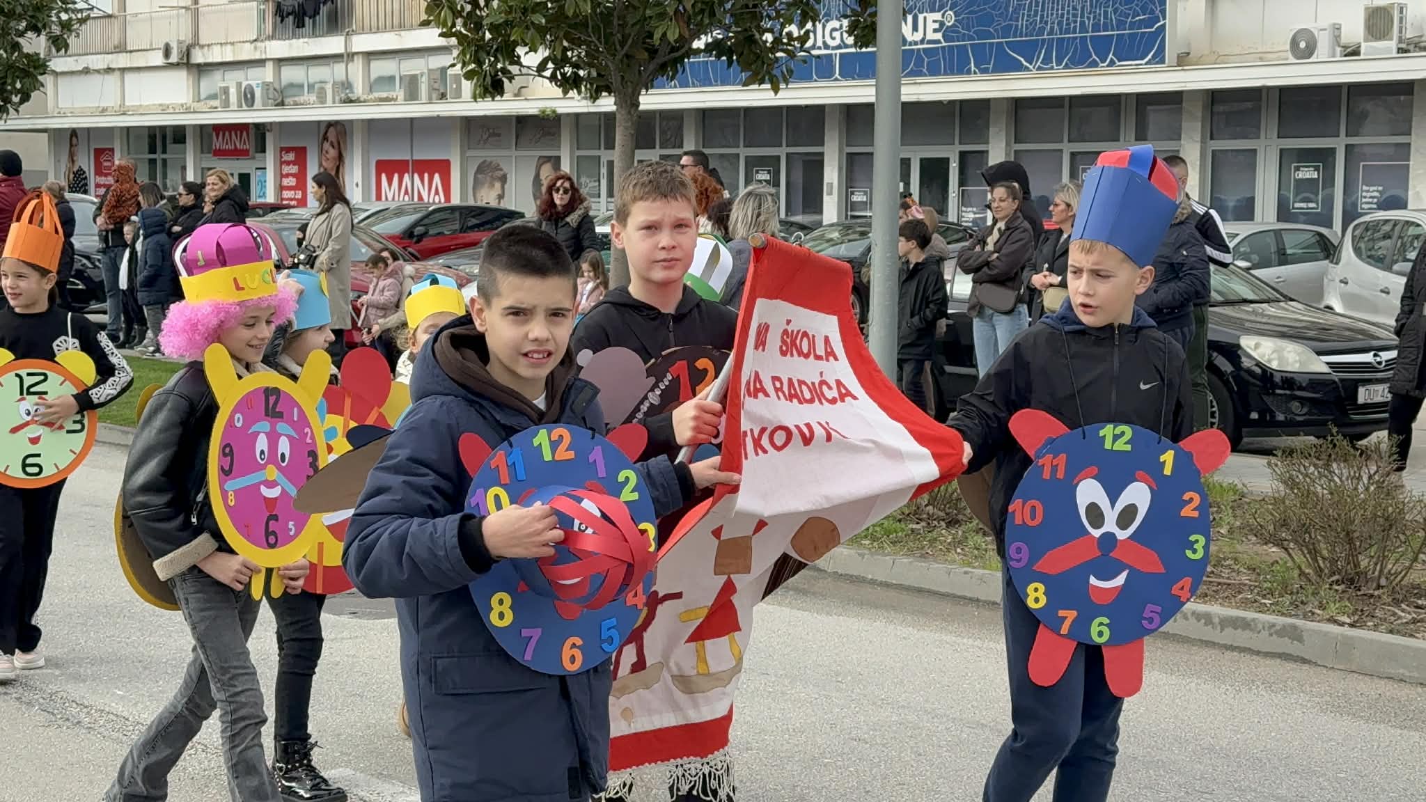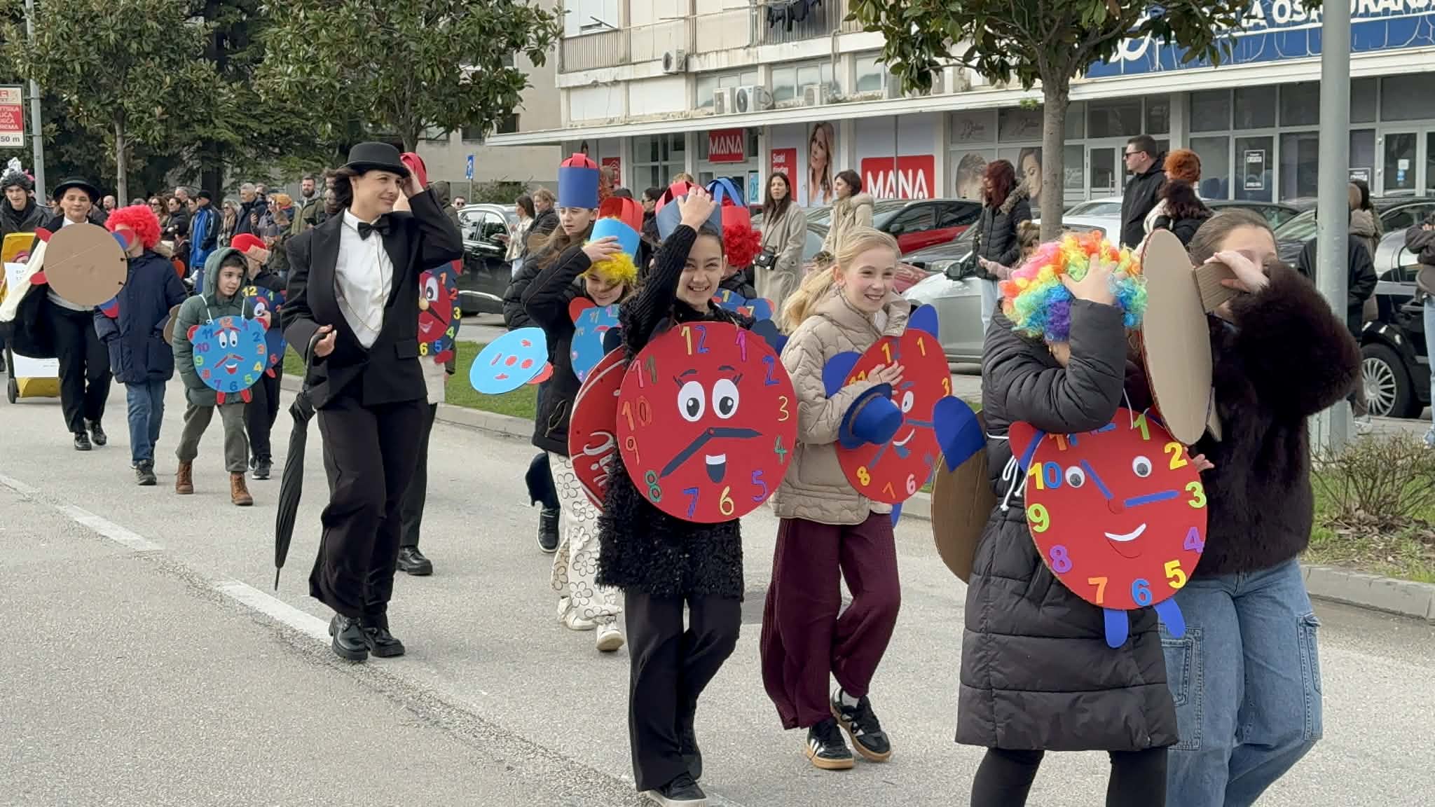 1. veljače 2026. godine u 14:00 sati, točno na vrijeme, iz Sportske ulice krenula je Velika povorka ulicama grada. Učenici naše škole ovog su puta postali mali, šareni i maštoviti satovi. Oko stotinjak veselih i nasmiješenih učenika neumorno je odrađivalo svoju „satnu dužnost“ točno ili ponešto manje točno. Uz satove smo uočili elegantnu i dobro raspoloženu gospodu s malim džepnim satovima. Ispod crnih uglađenih brčića, krile su se njihove učiteljice,koje neumorno njeguju tradiciju grada prenoseći je na nove naraštaje.  Vrijeme provedeno u maškarama nam je jednostavno proletjelo, ali uspomene su nam ostale urezane u sjećanje. Ove je godine vrijeme zaista bilo na našoj strani. S nestrpljenjem već iščekujemo sljedeće maškare i najavljujemo svoj povratak. „Festina lente – Požuri polako!“.