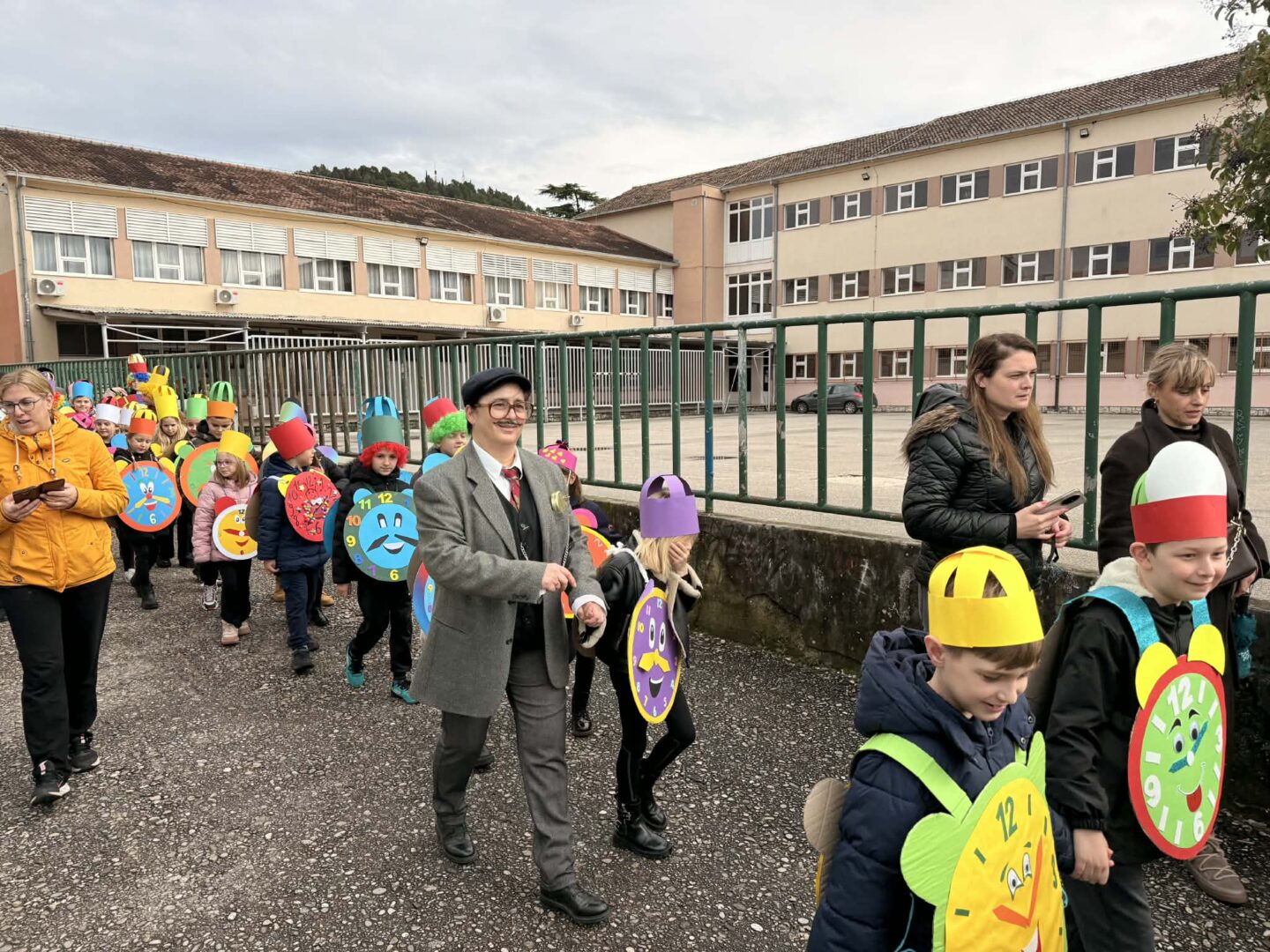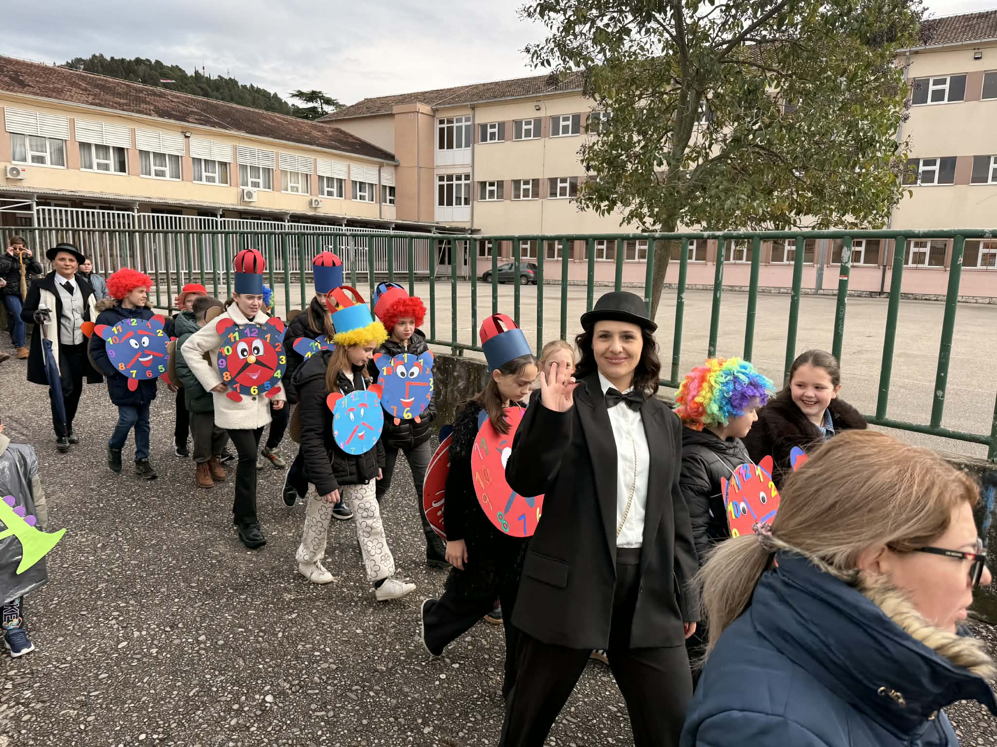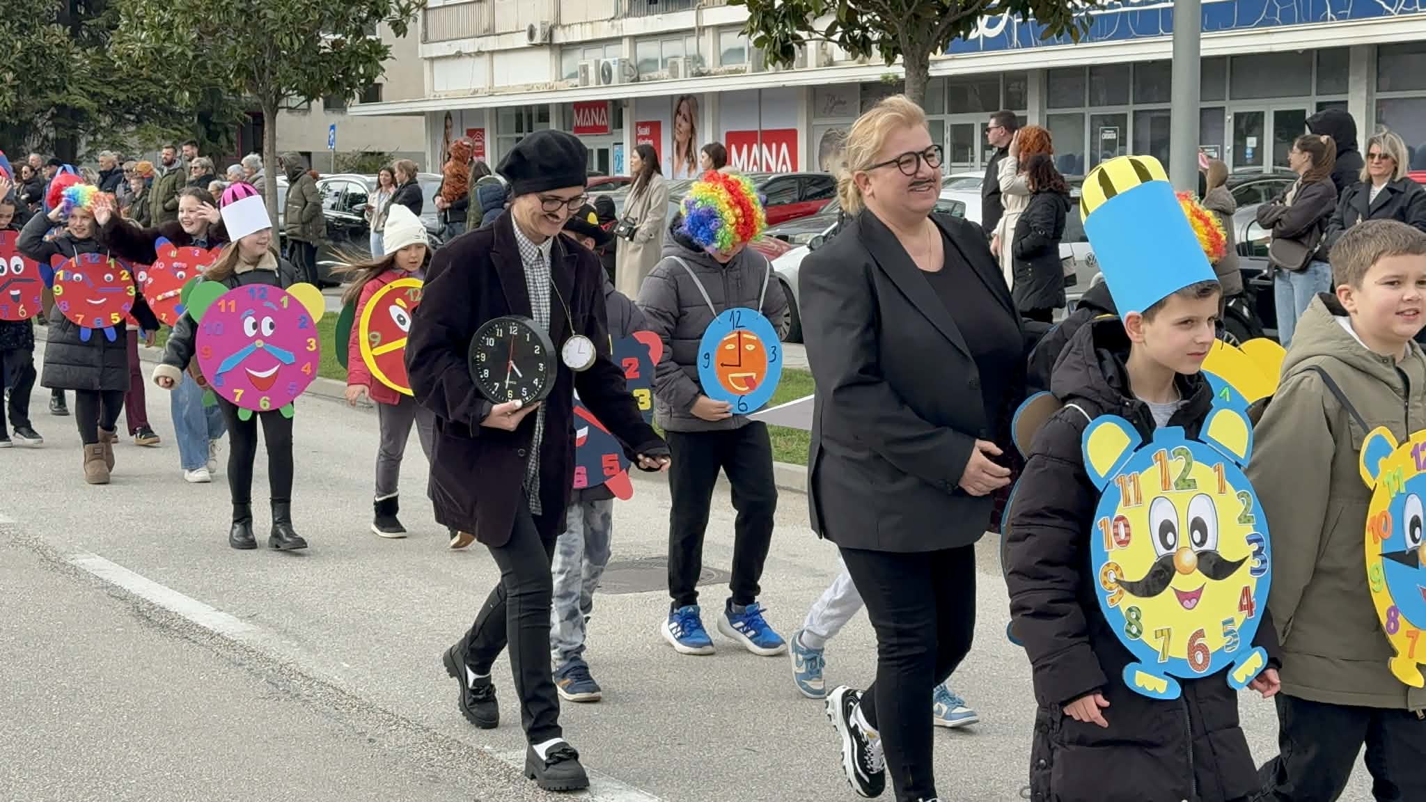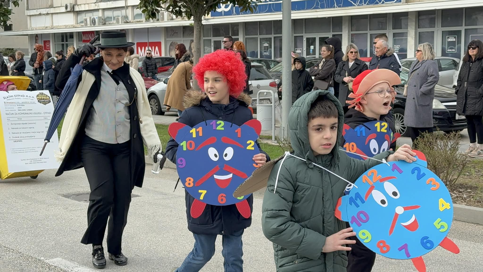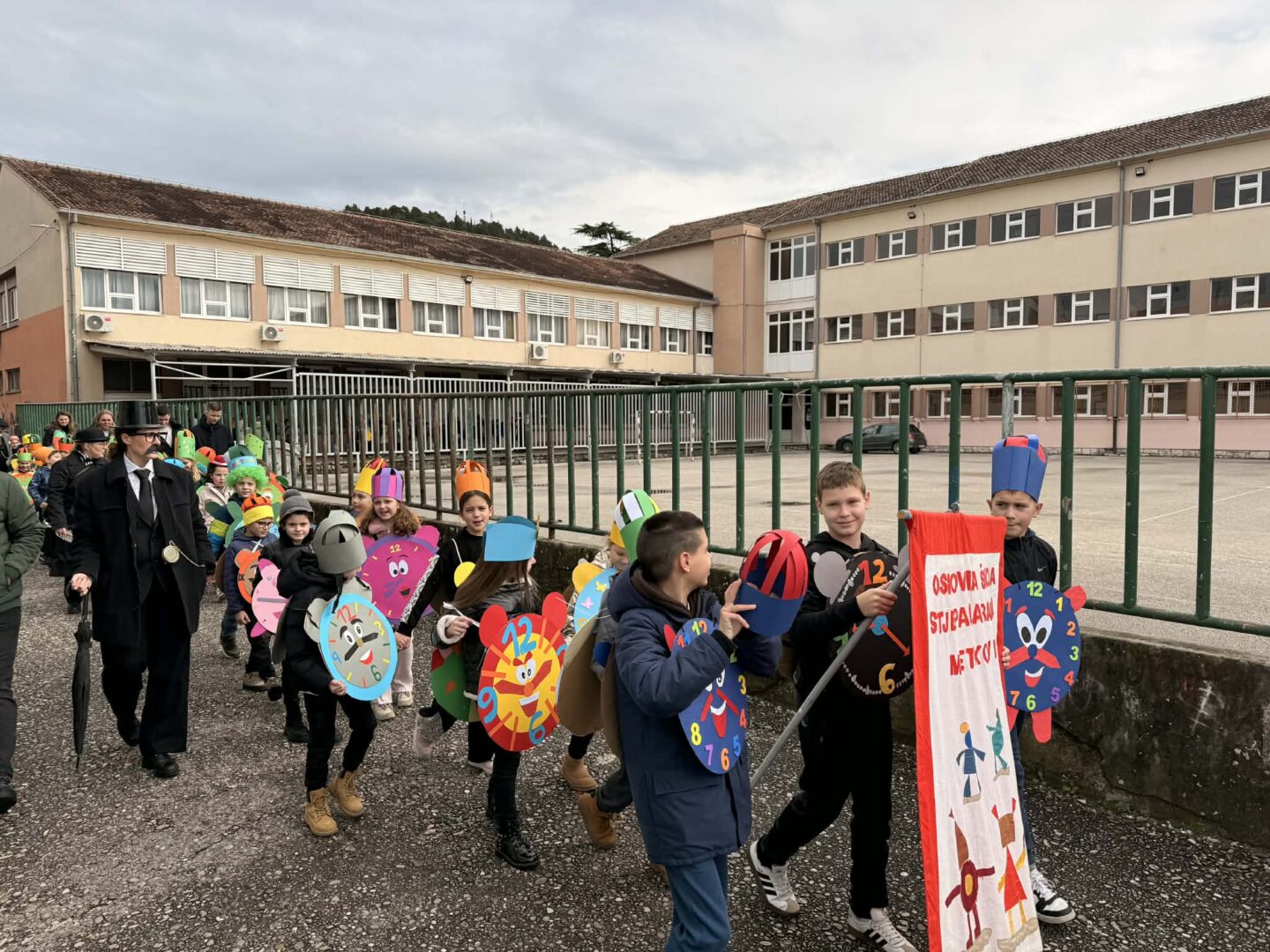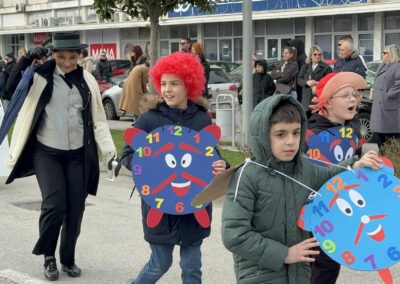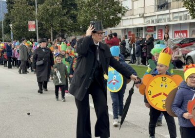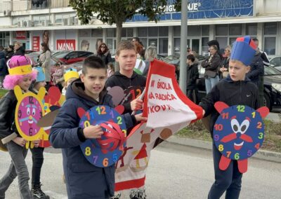 1. veljače 2026. godine u 14:00 sati, točno na vrijeme, iz Sportske ulice krenula je Velika povorka ulicama grada. Učenici naše škole ovog su puta postali mali, šareni i maštoviti satovi. Oko stotinjak veselih i nasmiješenih učenika neumorno je odrađivalo svoju „satnu dužnost“ točno ili ponešto manje točno. Uz satove smo uočili elegantnu i dobro raspoloženu gospodu s malim džepnim satovima. Ispod crnih uglađenih brčića, krile su se njihove učiteljice,koje neumorno njeguju tradiciju grada prenoseći je na nove naraštaje.  Vrijeme provedeno u maškarama nam je jednostavno proletjelo, ali uspomene su nam ostale urezane u sjećanje. Ove je godine vrijeme zaista bilo na našoj strani. S nestrpljenjem već iščekujemo sljedeće maškare i najavljujemo svoj povratak. „Festina lente – Požuri polako!“.