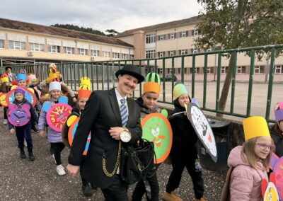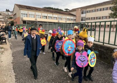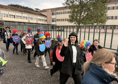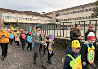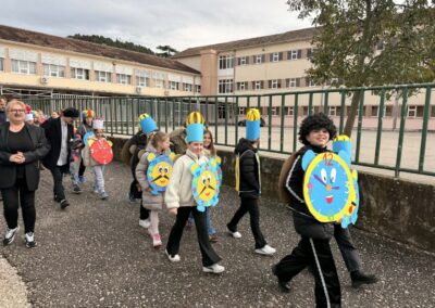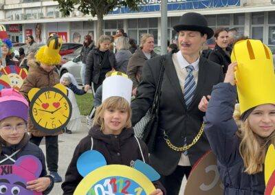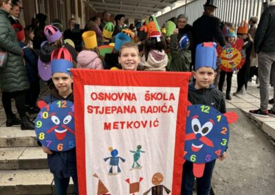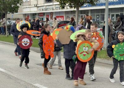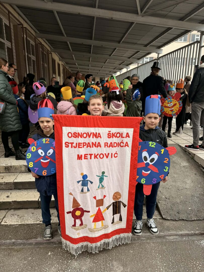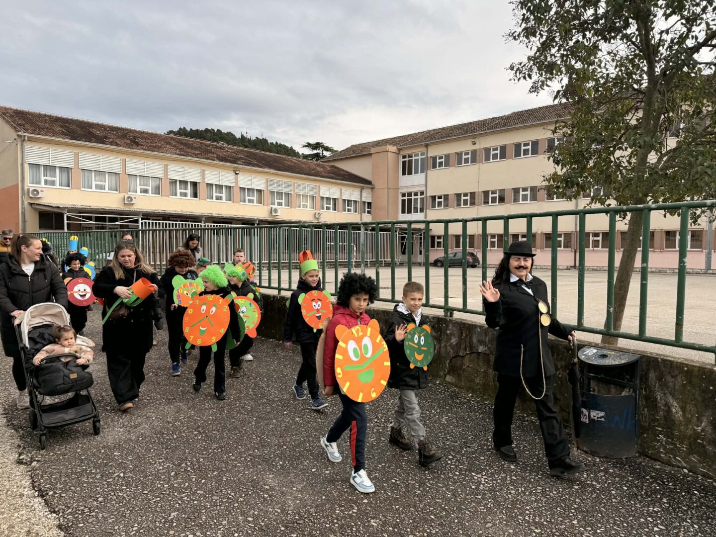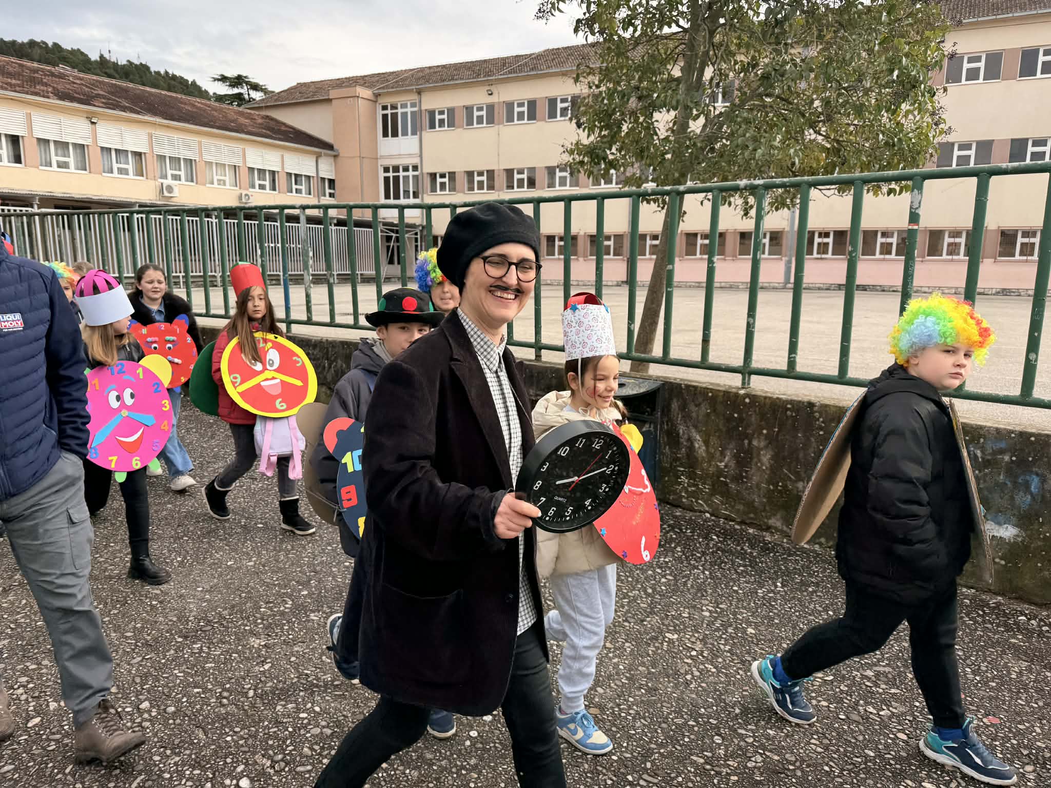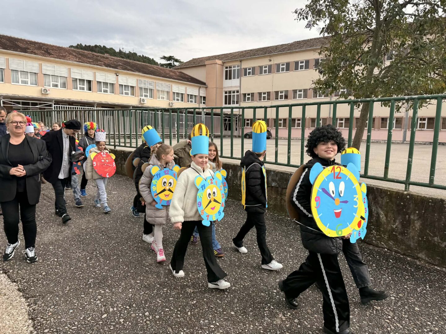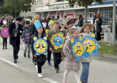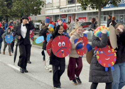 1. veljače 2026. godine u 14:00 sati, točno na vrijeme, iz Sportske ulice krenula je Velika povorka ulicama grada. Učenici naše škole ovog su puta postali mali, šareni i maštoviti satovi. Oko stotinjak veselih i nasmiješenih učenika neumorno je odrađivalo svoju „satnu dužnost“ točno ili ponešto manje točno. Uz satove smo uočili elegantnu i dobro raspoloženu gospodu s malim džepnim satovima. Ispod crnih uglađenih brčića, krile su se njihove učiteljice,koje neumorno njeguju tradiciju grada prenoseći je na nove naraštaje.  Vrijeme provedeno u maškarama nam je jednostavno proletjelo, ali uspomene su nam ostale urezane u sjećanje. Ove je godine vrijeme zaista bilo na našoj strani. S nestrpljenjem već iščekujemo sljedeće maškare i najavljujemo svoj povratak. „Festina lente – Požuri polako!“.